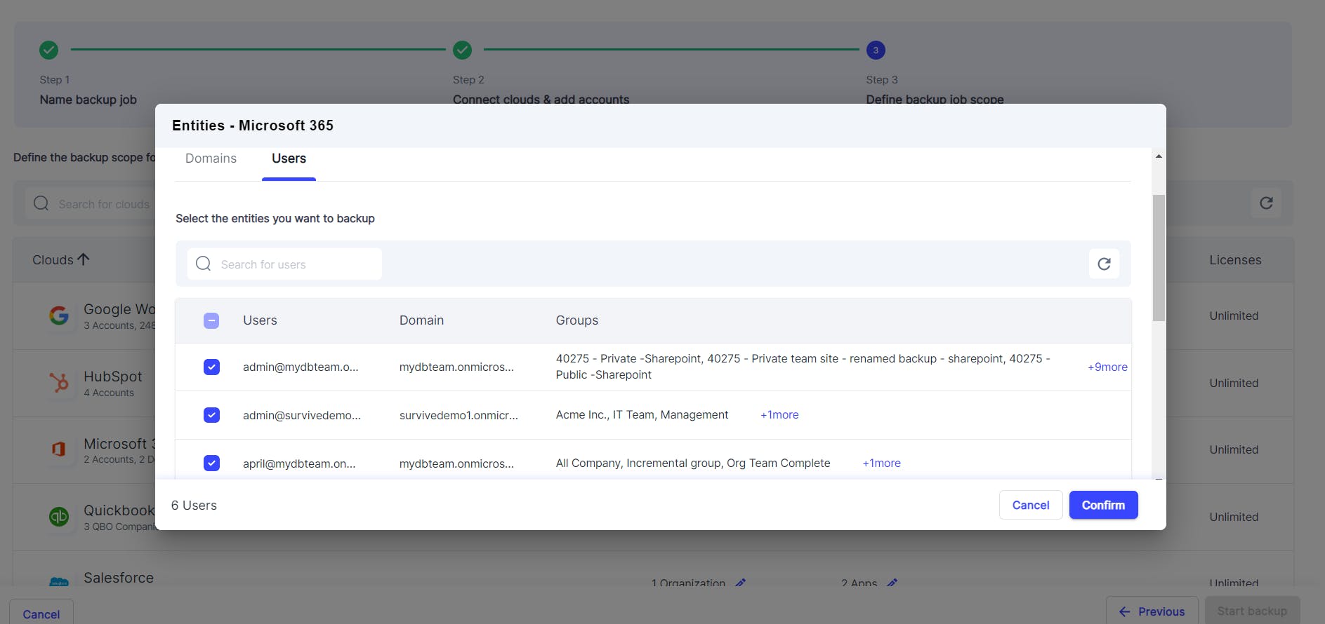 バックアップジョブを作成する際、管理者はバックアップに含めるユーザー、ドメイン、組織単位、およびMicrosoft 365 アプリ