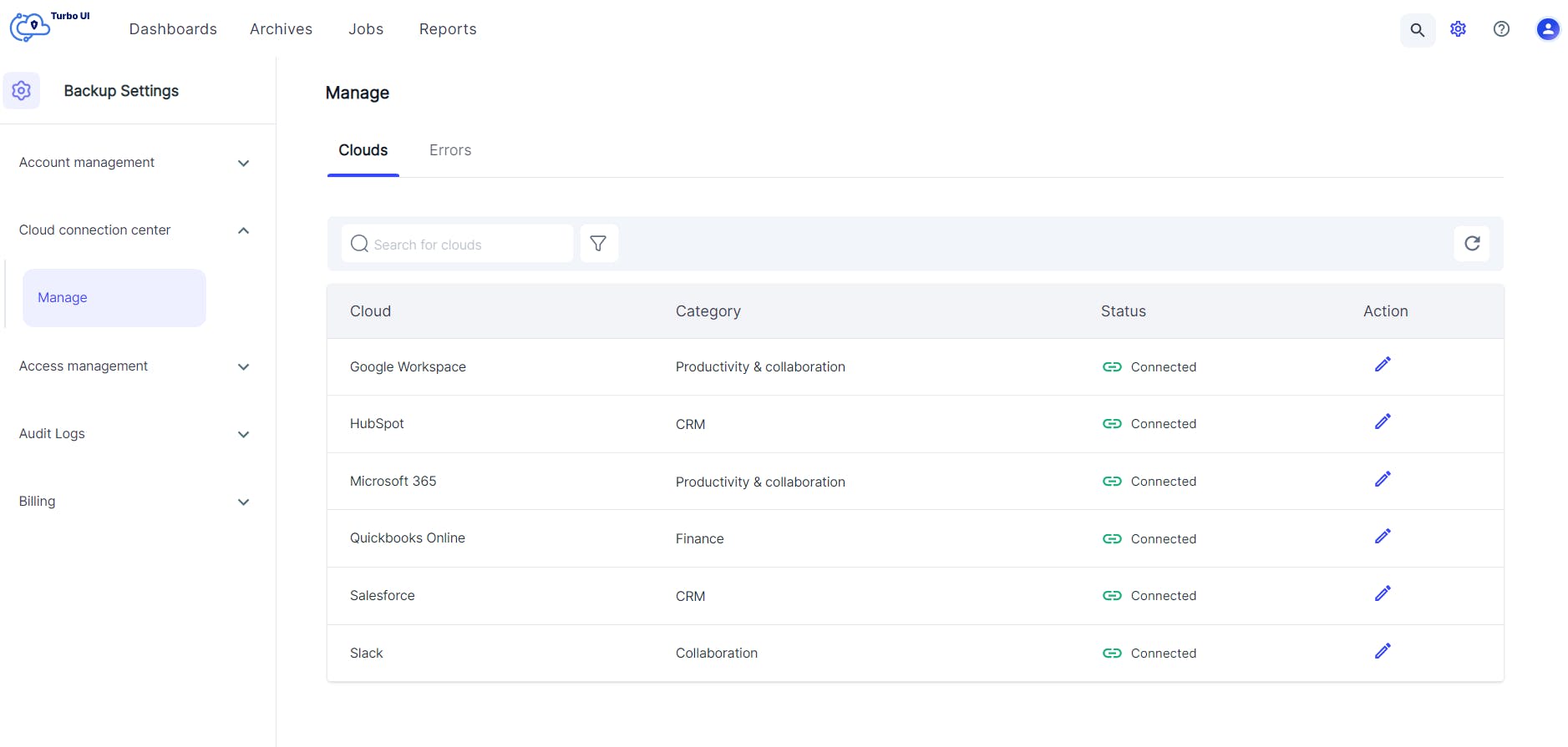 クラウド接続管理画面では、SysCloudに接続されているすべてのクラウドサービスとアカウントを一括管理できます。