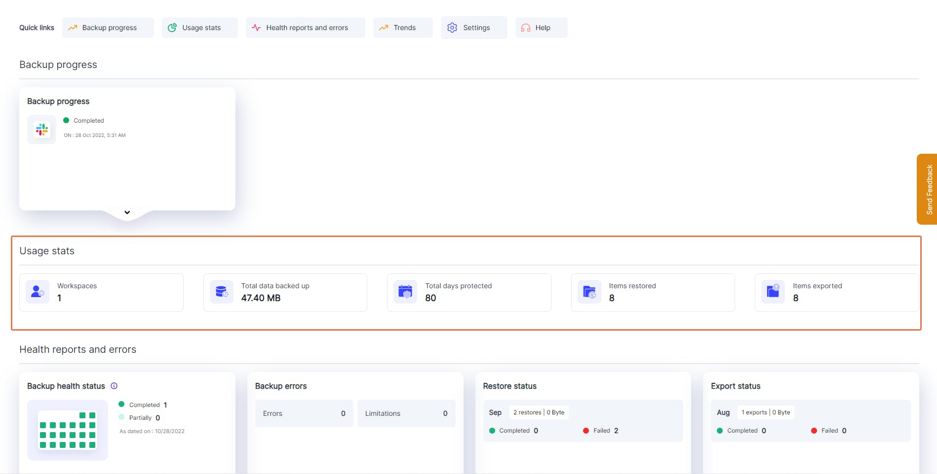ダッシュボードには、過去30日間のバックアップ状況のステータスと、過去90日間のリストアおよびエクスポートのステータスが表示されます。