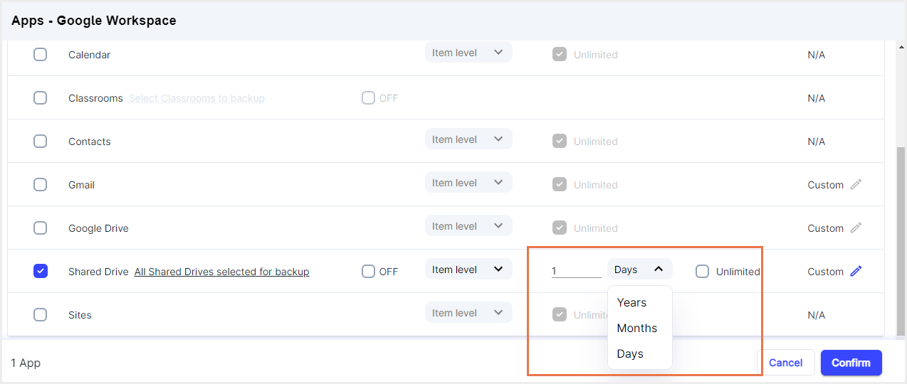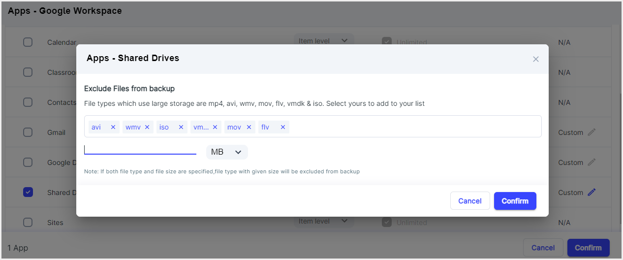 ステップ7:共有ドライブの保持期間を選択します。デフォルトでは、選択した共有ドライブは無制限に保持されます。特定の保持期間を指定するには、無制限オプションのチェックを外し、任意の保持期間を入力します。また、ファイルタイプやファイルサイズに基づいて、特定のファイルをバックアップから除外することもできます。