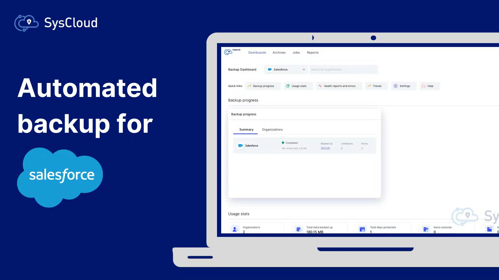 Automatically back up your Salesforce data and metadata. Let SysCloud handle any schema changes and API errors and give you complete visibility on your backups.